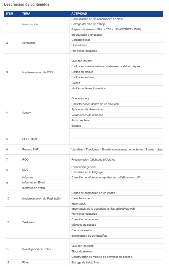 Desarrollar destrezas de desarrollo Web que complementan las habilidades de otros niveles de programación y lógica, estas habilidades serán enfocadas al manejo mas profesional y dinámico que muestra las tendencias del mercado y la posibilidad de complementar aplicaciones desktop o Web